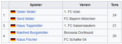 Der Kölner Torschützenkönig Dieter Müller (zusammen mit Gerd Müller von Bayern München mit je 24 Toren) erzielte am 3. Spieltag beim 7:2 gegen Werder Bremen sechs Tore, ein Bundesliga-Rekord.