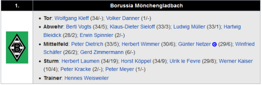 Mit Trainer Hennes Weisweiler und Spielmacher Günter Netzer gewann Borussia Mönchengladbach vor Titelverteidiger Bayern München seinen ersten Meistertitel. Bis 1977 sollten noch vier weitere Meisterschaften hinzukommen.