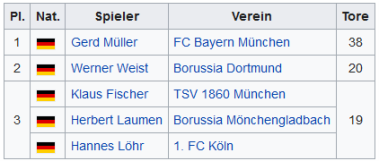Torschützenkönig wurde wie in der vorherigen Saison Gerd Müller von Bayern München mit 38 Toren.
