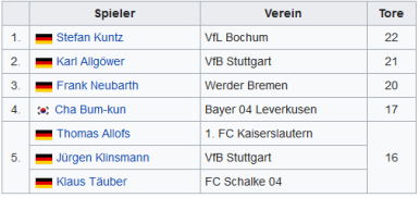 Da die Bayern auch den DFB-Pokal gewannen, qualifizierte sich der VfB Stuttgart als Vize-Pokalsieger für den Europapokal der Pokalsieger. Neben dem zweitplatzierten SV Werder Bremen qualifizierten sich Bayer 05 Uerdingen, Borussia Mönchengladbach und Bayer 04 Leverkusen für den UEFA-Pokal.